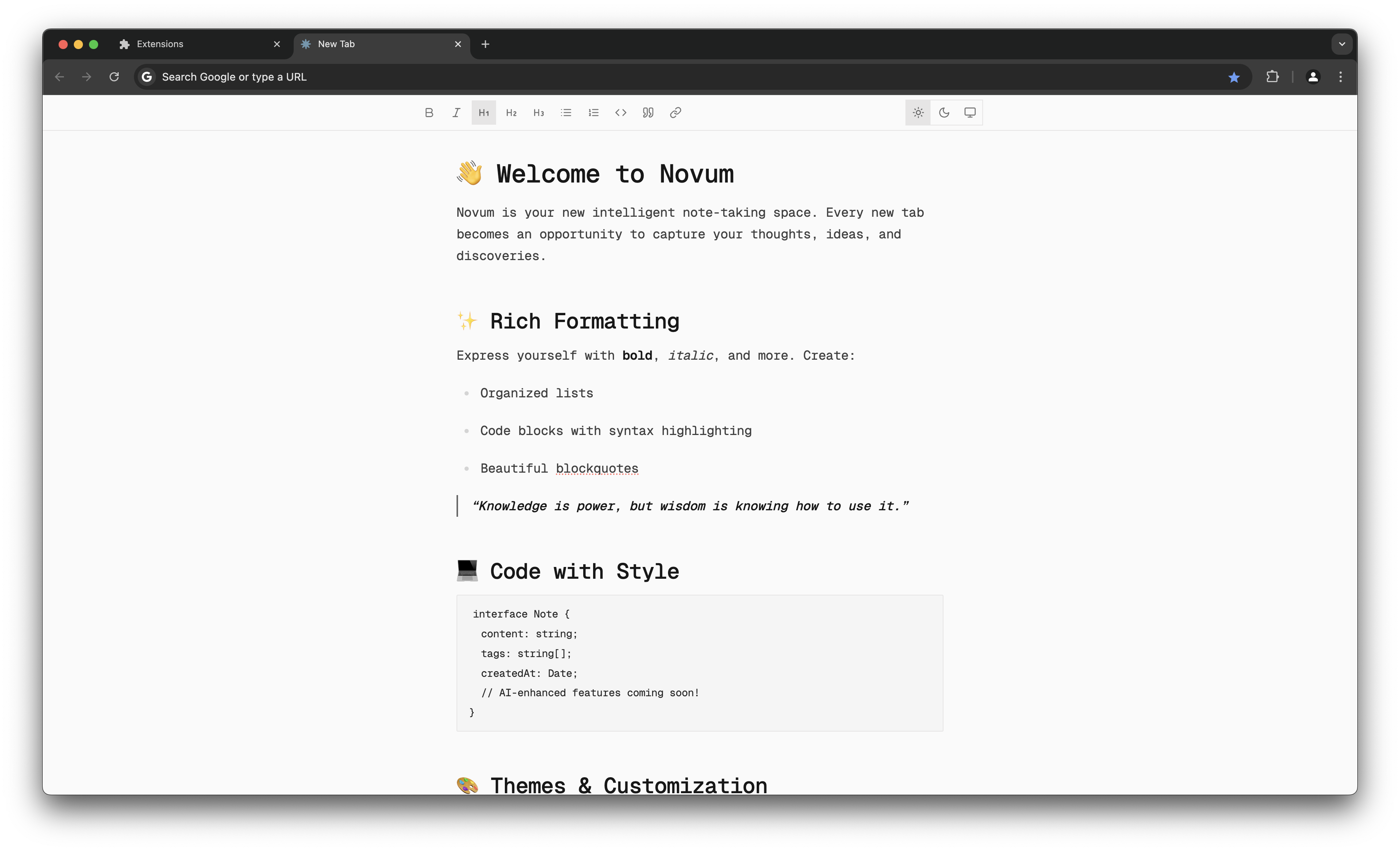 Novum transforms every new tab into a note-taking space, helping you capture thoughts and ideas without interrupting your workflow.